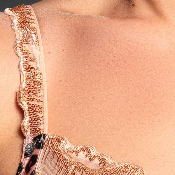 Deze BH van Louisa Bracq (model 546-01) is een absolute blikvanger voor wie houdt van luxe, detail en verfijning. Een unieke combinatie van dierenprint, goudaccenten en delicaat kant, afgewerkt in een zachte lichtroze perziktint.