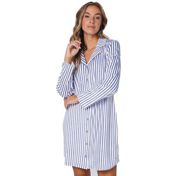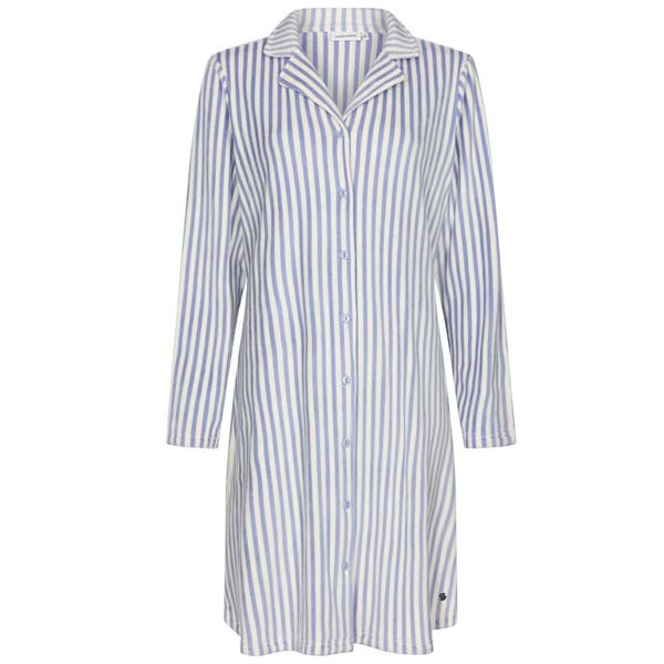 Zoekt u een warm doorknoop nachthemd dat heerlijk zacht aanvoelt in de winter? Dit Pastunette nachthemd uit de Blue Fog serie (111252-132-1) is een comfortabel dames nachthemd van flanel fleece van dikke kwaliteit. Het model is blauw-wit gestreept, heeft lange mouwen, een kraagje en is volledig doorknoopbaar. Dat draagt prettig en is ook praktisch bij aan- en uitkleden.