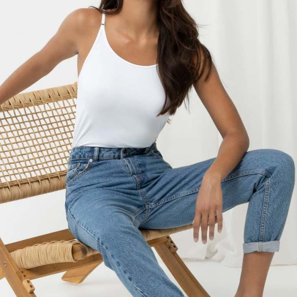 - Smalle verstelbare schouderbandjes en ronde hals.