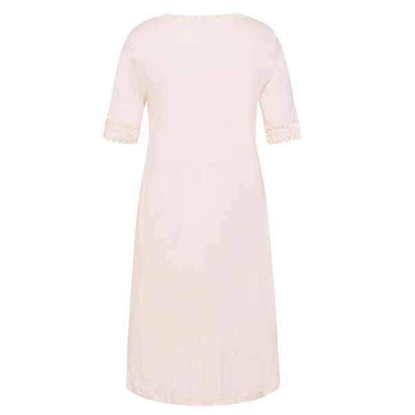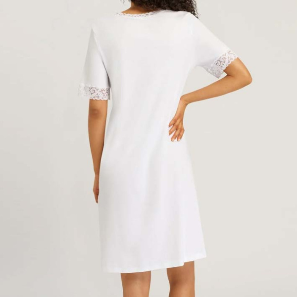 Het 100% Katoenen nachtjapon met halflange mouw Hanro moments 07 7040 biedt een ultiem comfort in een klassieke, tijdloze stijl. Het ontwerp heeft een uitlopende pasvorm met Vhals en halflange mouwen, welke zijn afgewerkt met prachtig kant.