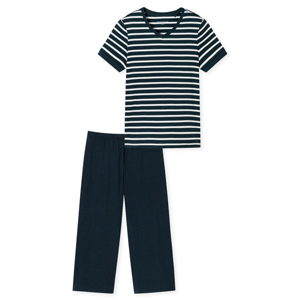 Deze damespyjama van Schiesser uit de Casual Essentials serie is gemaakt van 100% katoen in een comfortabele single jersey kwaliteit. Het setje bestaat uit een gestreept T-shirt met een V-hals en modieus omgeslagen mouwtjes, gecombineerd met een effen capribroek met elastische tailleband.
