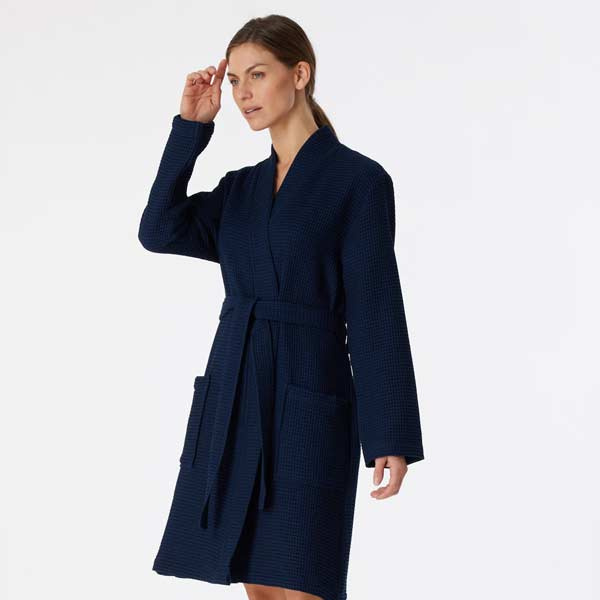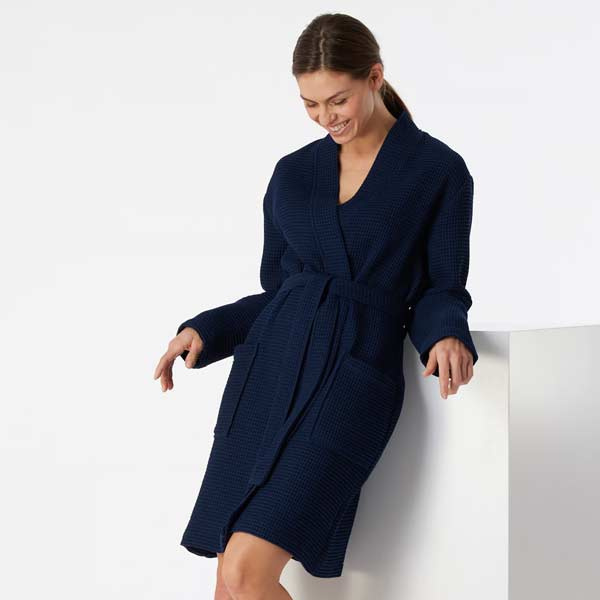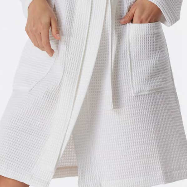 Zoekt u een dames badjas die licht aanvoelt en toch functioneel is bij vocht, dan is deze Schiesser badjas in wafelpiqué een logische keuze. Wafelpiqué (wafelstructuur) is luchtig, neemt vocht op en droogt doorgaans sneller dan een dikke badstof badjas. Daardoor is dit model prettig voor thuis, na het douchen, in de spa of als sauna badjas wanneer u iets zoekt dat niet te warm of te zwaar wordt.