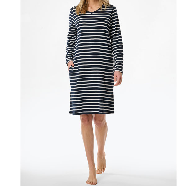 Praktisch detail zijn de twee zijdelingse, doorgestikte zakken die het nachthemd een casual uitstraling geven. Dankzij het ademende katoen voelt de stof soepel en comfortabel aan en blijft het nachthemd ook na vaak wassen mooi in model.