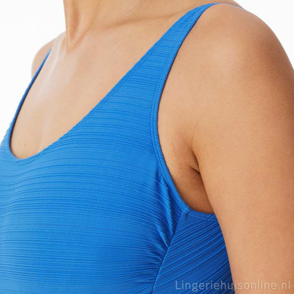 Het model is uitgevoerd in een elastische zachte jersey met fijne streepstructuur en een hoog aandeel gerecycled materiaal. Dit zorgt niet alleen voor een aangenaam draaggevoel, maar draagt ook bij aan een milieubewuste garderobe. De lage rug geeft het badpak een elegante uitstraling, terwijl de verstelbare schouderbandjes zorgen voor extra comfort en pasvorm.