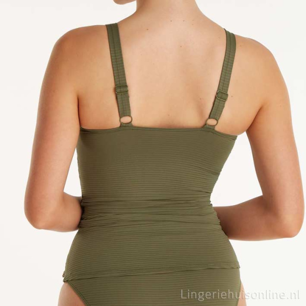 Dankzij de verstelbare bandjes en het diepe decolleté is deze top niet alleen praktisch, maar ook stijlvol. De pasvorm valt wat kleiner; het is aan te raden om een maatje groter te bestellen. Goed te combineren met de bijpassende bikinibroekjes uit dezelfde collectie. In een mooie olijf kleur.
