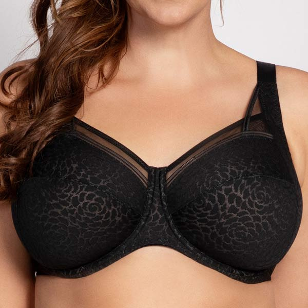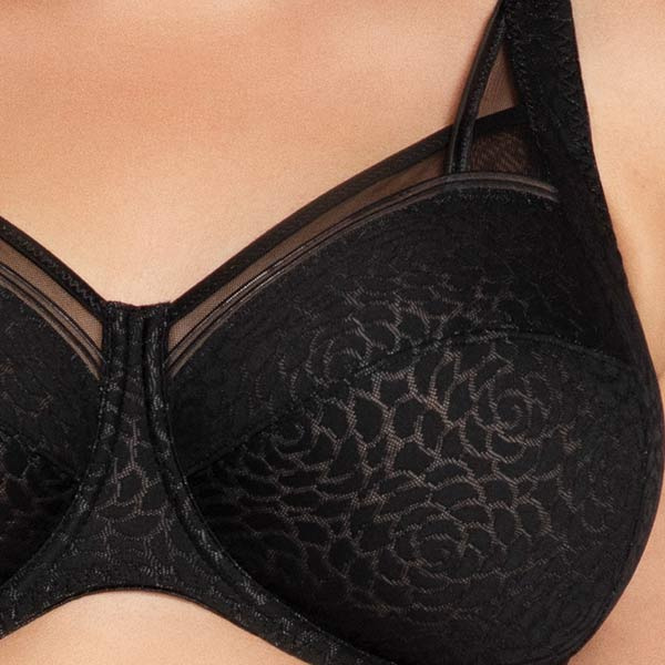 De cups zijn opgebouwd uit vier (en vanaf cup H zelfs vijf) delen en zijn dubbel gevoerd voor extra stevigheid. Er is geen padding gebruikt, wat zorgt dat er niet nog meer volume komt. De bovenkant van de cups is afgewerkt met een subtiele inzet van tule en een decoratief biesje, mooi en hierdoor sluit de bh ook mooi aan.