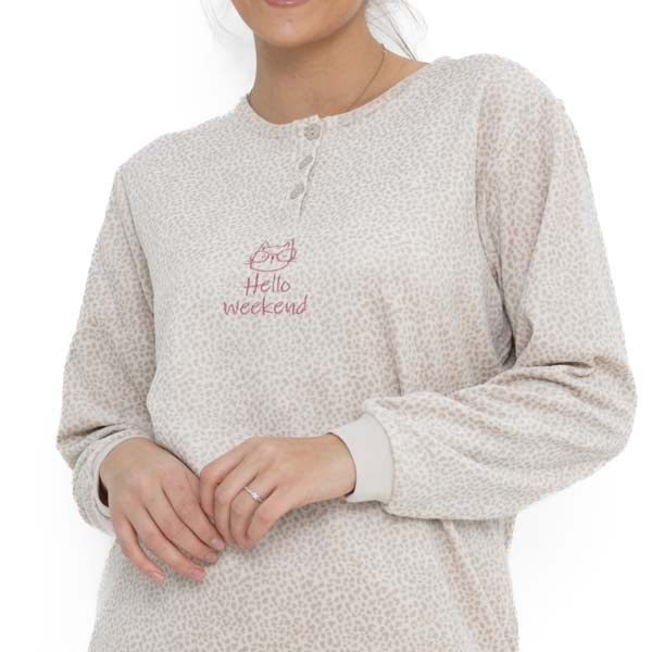 De pyjama bestaat uit een lange mouwen top en een lange broek. De stof voelt zacht op de huid en geeft net wat extra warmte, fijn in de herfst- en wintermaanden of als u het snel koud heeft. Door de rustige, verzorgde uitstraling kunt u deze pyjama ook prima dragen tijdens een relaxte ochtend of weekend thuis.