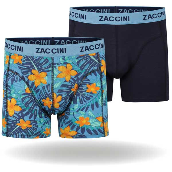 Zaccini underwear boxershorts Tropical Flower M25-277-03 een 2-pack heren boxershorts in blauwe kleuren, 1x effen donker blauw + 1x lichtere blauw met bloemen print in de bekende Zaccini pasvorm. Gehele aanbod Zaccini boxershorts.
