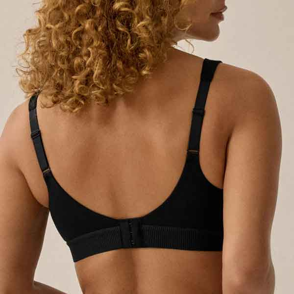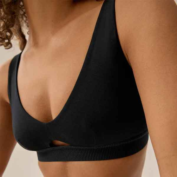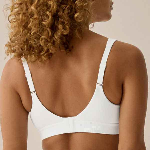 Het triangelmodel ondersteunt op een lichte manier en volgt de natuurlijke vorm van de borst. Omdat deze bh geen beugel en geen vulling heeft, blijft het silhouet zachter en minder opgebouwd. Het dubbellaagse materiaal zorgt voor meer stevigheid dan bij een enkelvoudige katoenen bh. De breed toelopende schouderbandjes verdelen het gewicht gelijkmatiger over de schouders, wat prettig is wanneer je een bh zoekt met wat meer ontlasting bovenaan. De brede ribband onder de borst helpt de bh goed op zijn plaats te blijven.