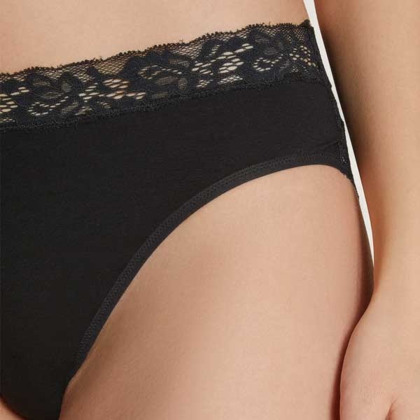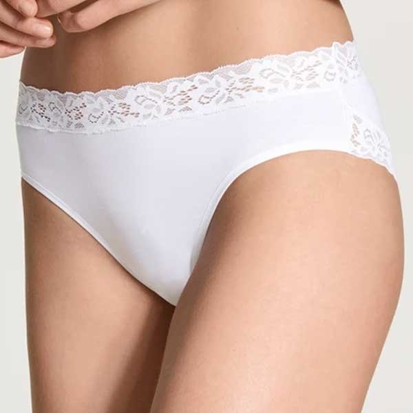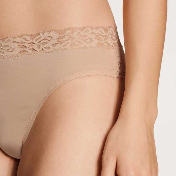 Calida tailleslip met kant 22756 Natural comfort lace - onderbroek met vlak kant uit de serie Natural comfort lace van het merk Calida. De slip heeft een katoenen kruisje, vlakke naden en kant langs de taille en achterkant van de beenopening. Bekijk de gehele collectie Calida ondergoed.