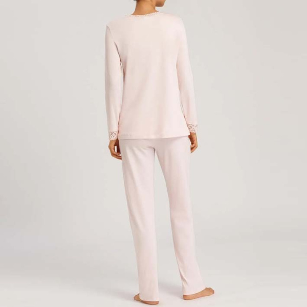 - Dames pyjama met lange mouw en lange broek, afgewerkt met kant.