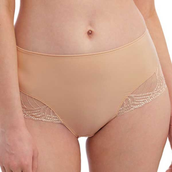 Hoge dames slip met kant FL101451 Fantasie - Elegante damesslip, gemaakt van 50% gerecyclede stof met Zwitsers gerecycled borduurwerk in geometrische stijl. De slip heeft een hoge taille met vlakke naden voor onzichtbaar dragen onder je kleding. Beschikbaar in verschillende kleuren. Bekijk de gehele collectie van Fantasie.