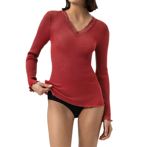 Mey 1110068 merinowollen dames shirt met kant. Luxe wol-zijde ondergoed in mooie kleurtjes zoals Boysenberry. Zacht, ademend en verwarmend. Gehele collectie wollen kleding van Mey ondergoed.