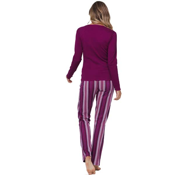 Rebelle pyjama Cin Cin 121252-622-1 is zo’n dames pyjama waar u meteen blij van wordt. Een comfortabele pyjamaset met een uni donkerroze top en een gestreepte broek, gemaakt om lekker in te slapen én om ontspannen in rond te lopen. Dit artikel is een kortingsartikel (sale), dus op = op.