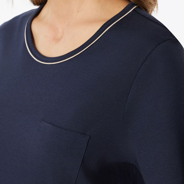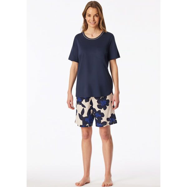 De Schiesser dames shortama 181235 uit de collectie Comfort Nightwear is een comfortabele en stijlvolle zomerpyjama. Het effen navy T-shirt heeft korte mouwen, een ronde hals met subtiele bies en een kleine borstzak. De afgeronde zoom geeft het shirt een moderne, soepel vallende pasvorm.