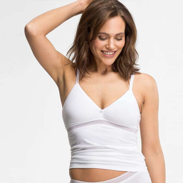 De cups zijn niet padded (zonder vulling) en geven een natuurlijke vorm. Onder de borst zit een grafisch kanten band. De bandjes zijn verstelbaar en het bh-hemd trekt u over het hoofd aan (geen sluiting op de rug). Door de gladde afwerking is het hemd bedoeld om onder kleding rustig te vallen.